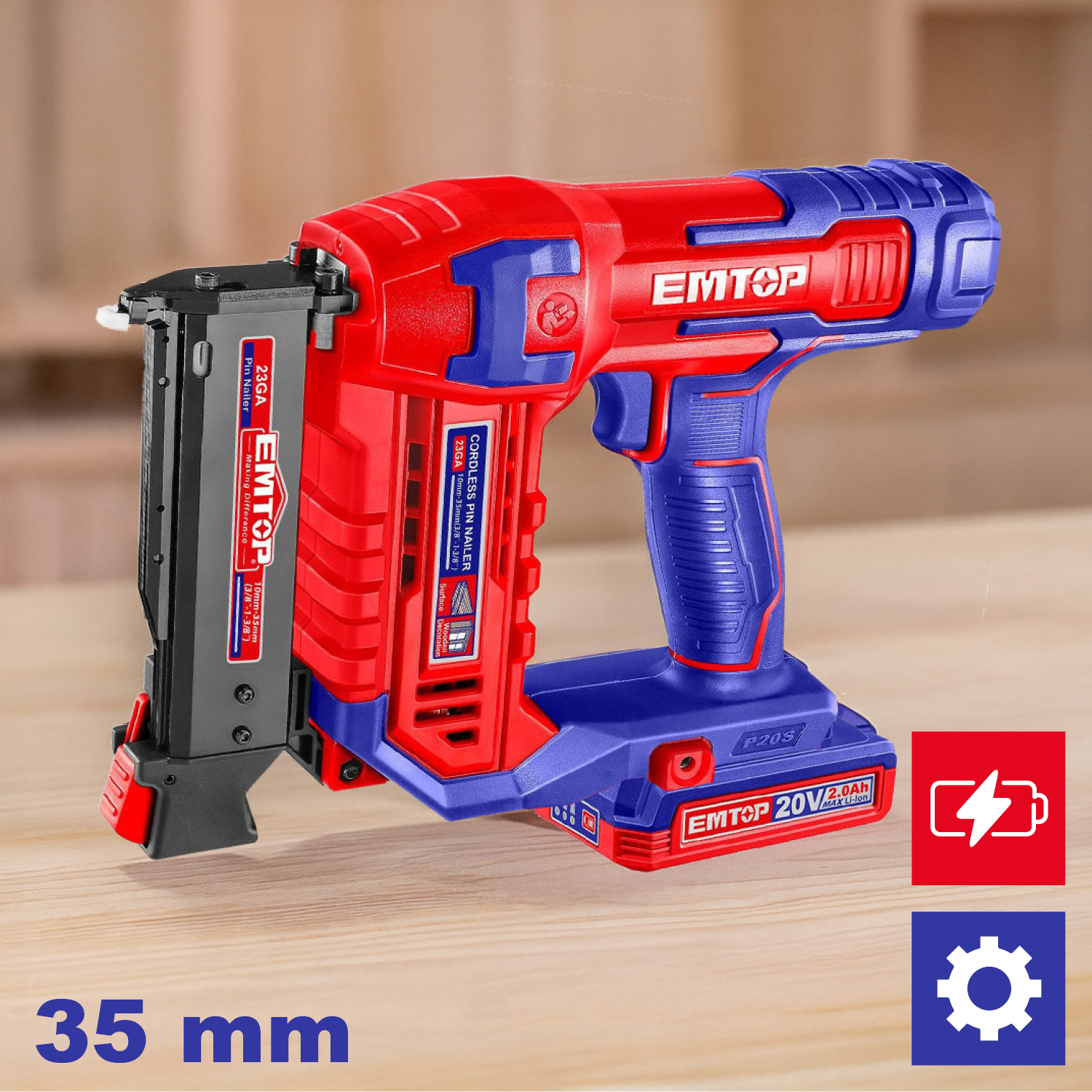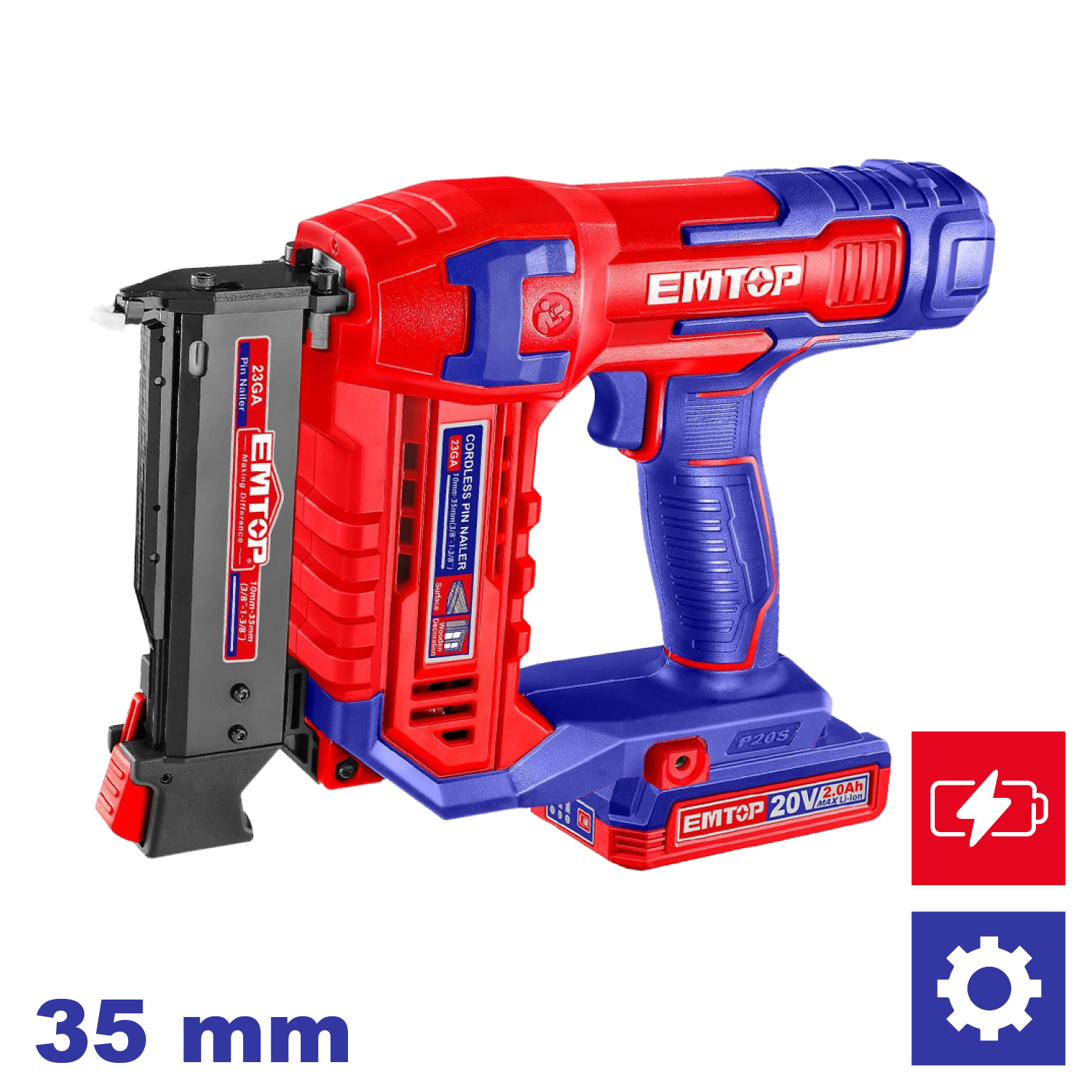Obsługa gwoździ PIN 23GA o długości 10–35 mm – idealna do drobnych prac wykończeniowych.
