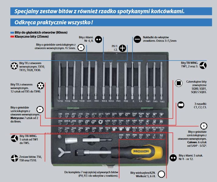 Super niezawodny zestaw bitów specjalnych PROXXON 75 elementów. Odkręca praktycznie wszystko!
