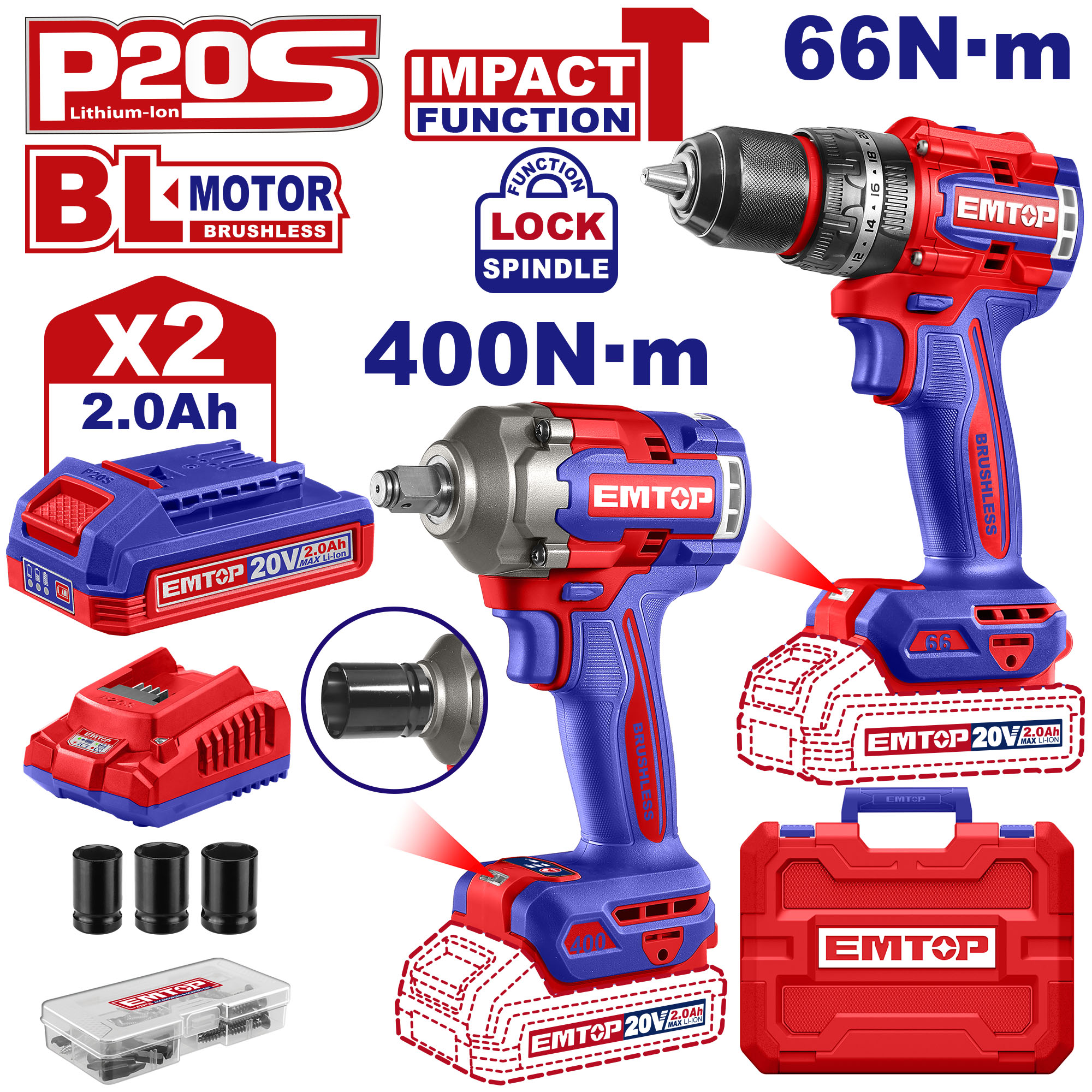 Do zestawu dołączone są dwa akumulatory 20 V o pojemności 2,0 Ah (EBPK2001), ładowarka 20 V (EFCR20200E), a także 47 akcesoriów, wśród których znajdują się m.in. nasadki (17, 19, 21 mm), i wszystko to zapakowane jest w solidną walizkę transportową.